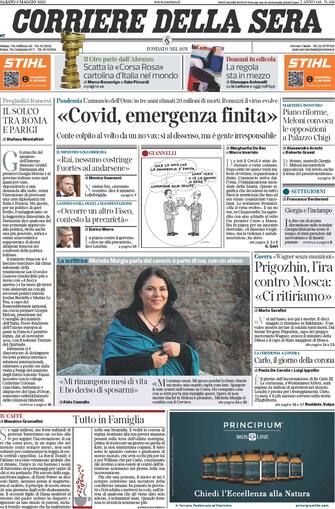 Corriere della Sera: Apertura con titolo "Covid emergenza finita". L'annuncio dell'Oms: in tre anni stimati 20 milioni di morti. Remuzzi: il virus evolve. Conte colpito al volto da un no vax: sì al dissenso ma è gente irresponsabile