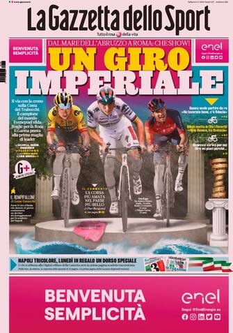 Gazzetta dello Sport: Apertura con titolo "Un giro imperiale". Il via con la crono sulla Costa dei Trabocchi. I campione del mondo Evenepoel sfida Roglie per la Rosa. E Ganna punta alla prima maglia di leader