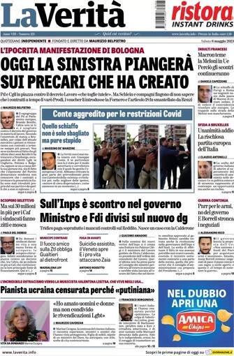 La Verità: Apertura con titolo "Oggi la sinistra piangerà sui precari che ha creato". L'ipocrita manifestazione di Bologna. Pd e Cgil in piazza contro il decreto Lavoro "che toglie tutele. Ma Schlein e compagni fingono di non sapere che i contratti a tempo li varò Prodi, i vouvher li introdusse la Fornero e l'articolo 18 fu smantellato da Renzi