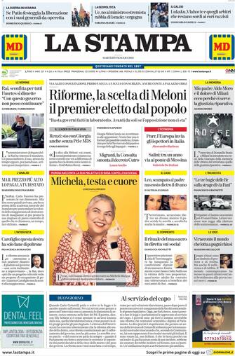 La Stampa: apertura con titolo "Riforme, la scelta di Meloni il premier eletto dal popolo". Basta governi fatti in laboratorio. Avanti da soli se l'opposizione non ci sta