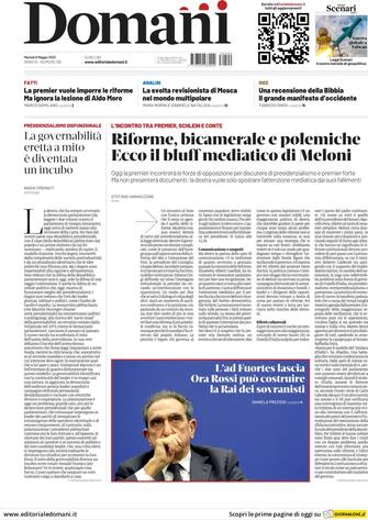 Domani: apertura con titolo "Riforme, bicamerale e polemiche. Ecco il bluff mediatico di Meloni". Oggi la Premier incontrerà le forze di opposizione per discutere di presidenzialismo e premier forte, ma non presenterà documenti: la destra vuole solo spostare l'attenzione mediatica dai suoi fallimenti