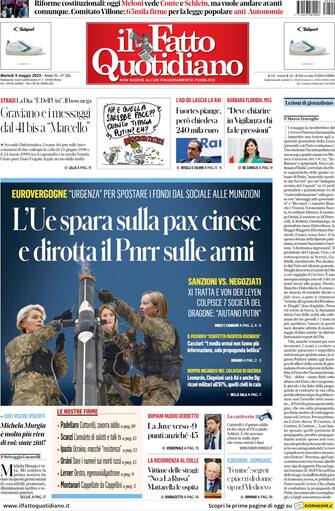 Il Fatto Quotidiano: apertura con titolo "L'Ue spara sulla pax cinese e dirotta il Pnrr sulle armi". Spazio a "Graviano e i messaggi dal 41 bis a Marcello"