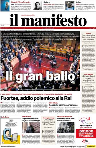 Il Manifesto: apertura con titolo "Il gran ballo". Il senato si fa la festa di 75 anni invitando Morandi a cantare nell'aula. Si festeggia anche il compleanno della Costituzione, che Meloni minaccia di cambiare da sola