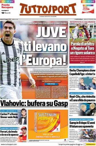 Tuttosport: apertura con titolo "Juve, ti levano l'Europa!". Le motivazioni del Collegio sono dure. Spazio a "Vlahovic: bufera su Gasp"