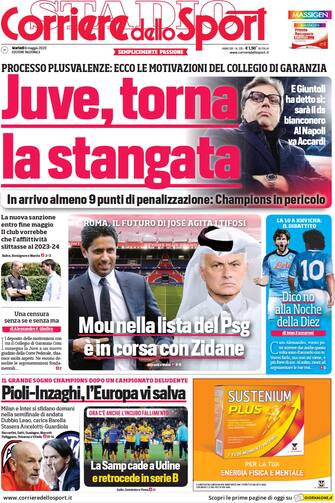 Corriere dello Sport: apertura con titolo "Juve, torna la stangata". Processo plusvalenze: ecco le motivazioni del collegio di garanzia. Spazio a "Mou nella lista del Psg, è in corsa con Zidane"
