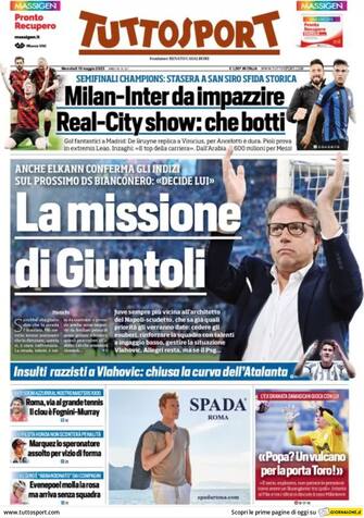 Tuttosport: apertura con titolo "La missione di Giuntoli". Anche Elkann conferma gli indizi sul prossimo ds bianconero: decide lui. Spazio a "Milan-Inter da impazzire. Real-City show: che botti"