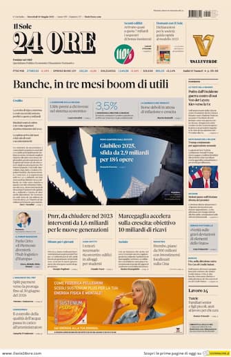 Il Sole 24 Ore: apertura con titolo "Banche, in tre mesi boom di utili". Spazio a "Pnrr, da chiudere nel 2023, interventi da 1,6 miliardi per le nuove generazioni"