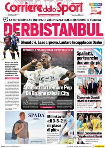 Corriere dello Sport: apertura con titolo "Derbistanbul". Giroud c'è. Leao ci prova. Lautaro in coppia con Dzeko. Spazio ad "Ancelotti fa tremare Pep. De Bruyne salva il City"
