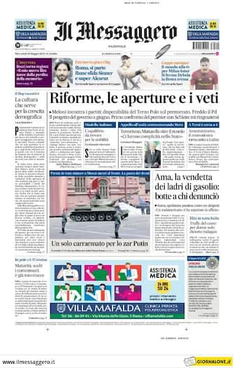 Il Messaggero: apertura con titolo "Riforme, le aperture e i veti". Meloni incontra i partiti: disponibilità del Terzo Polo sul premierato. Freddo il Pd. Il progetto del governo a giugno. Primo confronto del premier con Schlein: mi ringrazierai