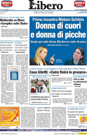 Libero: apertura con titolo "Primo incontro Meloni-Schlein: donna di cuori e donna di picche". Giorgia apre sulle riforme, Elly dice no a tutto. Ha paura
