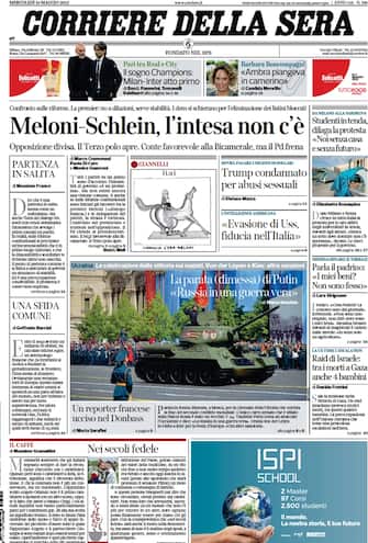 Corriere della Sera: apertura con titolo "Meloni-Schlein, l'intesa c'è". Opposizione divisa. Il Terzo Polo apre. Conte favorevole alla bicamerale, ma il Pd frena. Spazio a "La parata (dimessa) di Putin: Russia in una guerra vera"