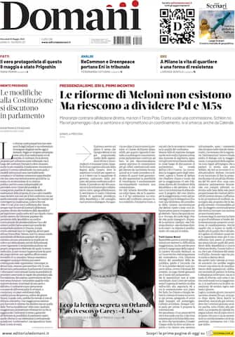 Domani: apertura con titolo "Le riforme di Meloni non esistono, ma riescono a dividere Pd e Ms5". Minoranze contrarie all'elezione diretta, ma non il Terzo Polo. Conte vuole una commissione, ma Schlein no