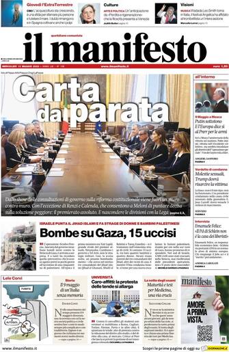Il Manifesto: apertura con titolo "Carta da parata". Dallo show delle consultazioni di governo sulla riforma costituzionale viene fuori un muro contro muro. Con l'eccezione di Renzi e Calenda, che consentono a Meloni di puntare decisa sulla soluzione peggiore: il premierato assoluto. E nascondere le divisioni con la Lega