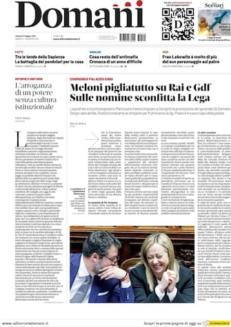 Domani: apertura con titolo "Meloni pigliatutto su Rai e Gdf. Sulle nomine sconfitta la Lega". La Premier e il sottosegretario Mantovano hanno imposto a Giorgetti la promozione del generale De Gennaro. Sergio sarà ad Rai, Rossi (nonostante le simpatie per Putin) verso la dg. Pisano è il nuovo capo della polizia
