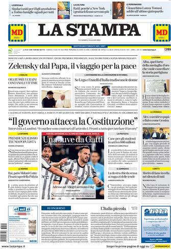 La Stampa: apertura con titolo "Il governo attacca la Costituzione". Intervista a Landini: "I voucher sono contrari all'articolo 1. Pronti a tutto per tutelare il lavoro". Spazio a "Zelensky dal Papa, il viaggio per la pace"