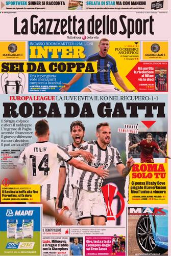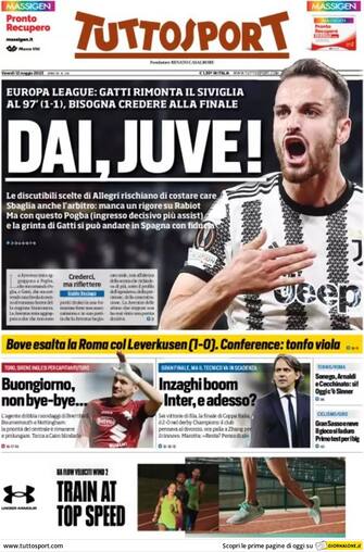 Tuttosport: apertura con titolo "Dai, Juve!". Europa League: Gatti rimonta il Siviglia al 97' (1-1), bisogna credere alla finale. Spazio a "Inzaghi boom. Inter, e adesso?"