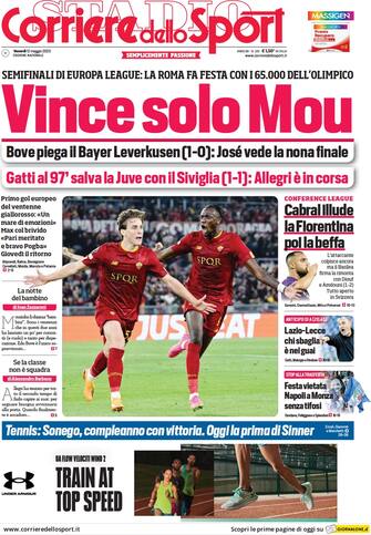Corriere dello Sport: apertura con titolo "Vince solo Mou". Semifinali di Europa League: la Roma fa festa con i 65mila dell'Olimpico. I giallorossi con un gol di Bove hanno la meglio sul Bayer Leverkusen. Pareggio per la Juventus contro il Siviglia (1-1) e sconfitta della Fiorentina in Conference League contro il Basilea (1-2 a Firenze)