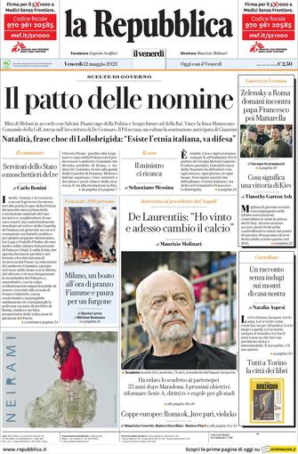 La Repubblica: apertura con titolo "Il patto delle nomine". Blitz di Meloni in accordo con Salvini: Pisani capo della Polizia e Sergio futuro ad della Rai. Vince la linea Mantovano. Comando della Gdf, intesa sull'investitura di De Gennaro. Il Pd accusa: un vulnus la sostituzione anticipata di Giannini