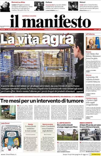 Il Manifesto: apertura con titolo "La vita agra". Il governo sblocca 660 milioni per gli alloggi universitari, ma sono briciole di cui trarranno vantaggi soprattutto i privati. Da Venezia a Napoli cresce la protesta delle tende davanti agli atenei per il caro affitti. Mentre monta l'allarme per i prezzi drogati dei prodotti alimentari
