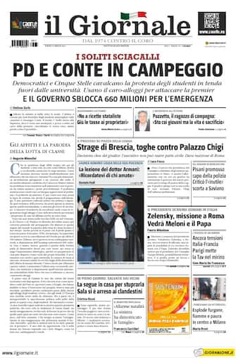 Il Giornale: apertura con titolo "I soliti sciacalli: Pd e Conte in campeggio". Democratici e Cinque Stelle cavalcano la protesta degli studenti in tenda fuori dalle università. Usano il caro-alloggi per attaccare la Premier