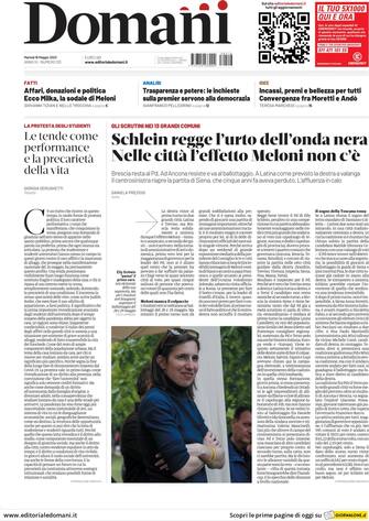 Domani: apertura con titolo "Schlein regge l'urto dell'onda nera. Nelle città l'effetto Meloni non c'è". Brescia resta al Pd. Ancona resiste e va al ballottaggio. A Latina come previsto la destra a valanga. Il centrosinistra riapre la partita di Siena, che cinque fa aveva perduto. L'affluenza in calo
