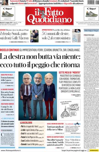 Il Fatto Quotidiano: apertura con titolo "La destra non butta via niente, ecco tutto il peggio che ritorna". Riciclo continuo: gli impresentabili Ferri, Scaroni, Brunetta, Siri, Cingolani&C