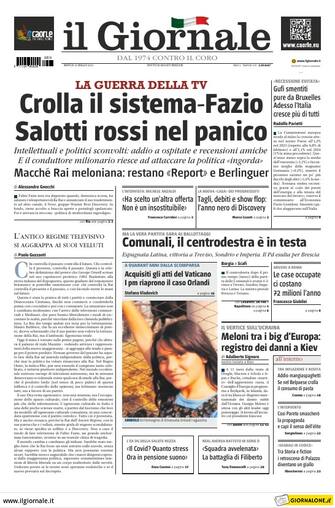 Il Giornale: apertura con titolo "La guerra della tv: Crolla il sistema-Fazio. Salotti rossi nel panico". Intellettuali e politici sconvolti: addio a ospitate e recensioni amiche. E il conduttore milionario riesce ad attaccare la politica "ingorda"