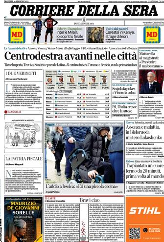 Corriere della Sera: apertura con titolo "Centrodestra avanti nelle città". Tiene Imperia, Treviso, Sondrio e prende Latina. Al centrosinistra Teramo e Brescia, con la prima sindaca