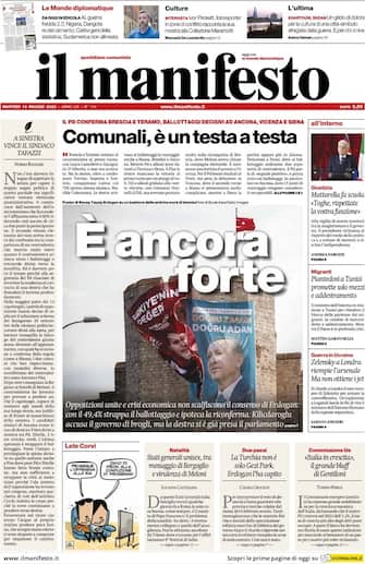Il Manifesto: apertura con il titolo "E' ancora forte". Opposizioni unite e crisi economica non scalfiscono il consenso di Erdogan: con il 49,4% strappa il ballottaggio e ipoteca la riconferma. Kilicdaroglu accusa il governo di brogli, ma la destra si è già presa il parlamento