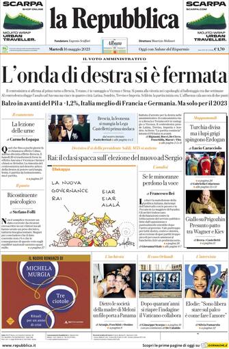 La Repubblica: apertura con titolo "L'onda di destra si è fermata". Il centrosinistra si afferma al primo turno a Teramo e Brescia, è in vantaggio a Vicenza e Siena. Si punta alla vittoria nei capoluoghi al ballottaggio tra due settimane. Al centodestra sfugge l'assalto ad Ancona ma vince in quattro città: Latina, Sondrio, Treviso e Imperia