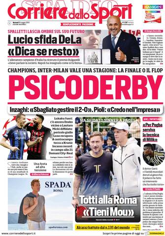 Corriere dello Sport: apertura con titolo "Psicoderby". Champions, Inter-Milan vale una stagione: la finale o il flop. Inzaghi: "Sbagliato gestire il 2-0". Pioli: "Credo nell'impresa"