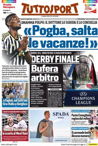 Tuttosport: apertura con titolo "Derby finale, bufera arbitro". Ore 21: brividi Champions. Spazio a "Pogba, salta le vacanze!". Dramma Polpo: il dottore lo sgrida e lo consiglia