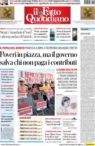 Il Fatto Quotidiano apre con la manifestazione a Roma contro la riforma del reddito di cittadinanza. Nel taglio in alto si torna a parlare delle stragi dei primi anni '90 e del ponte sullo stretto di Messina