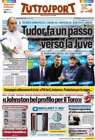 Tuttosport: apertura con titolo "Tudor fa un passo verso la Juve". Il tecnico annuncia l'addio al Marsiglia: adesso è libero