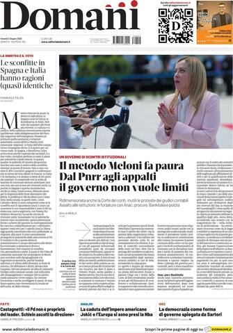 Domani: apertura con titolo "Il metodo Meloni fa paura. Dal Pnrr agli appalti, il governo non vuole limiti". Ridimensionata anche la Corte dei Conti: inutili le proteste dei giudici contabili. Assalto alle istituzioni: le forzature con Anac, procure, Bankitalia e polizia