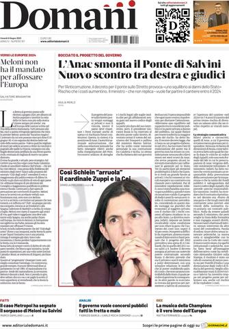 Domani: apertura con titolo "L'Anac smonta il Ponte di Salvini. Nuovo scontro tra destra e giudici". Spazio a "Così Schlein arruola il cardinale Zuppi e la Cei"