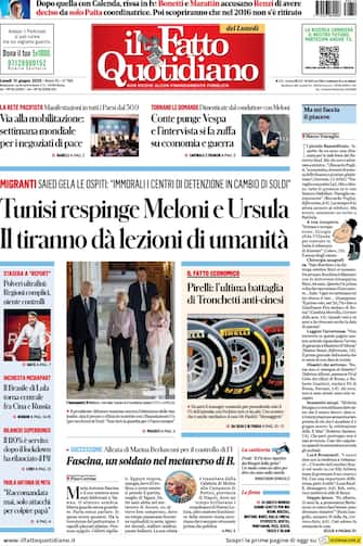 Il Fatto Quotidiano: apertura con titolo "Tunisi respinge Meloni e Ursula. Il tiranno dà lezione di umanità". Saied gela le ospiti: "Immorali i centri di detenzione in cambio di soldi"