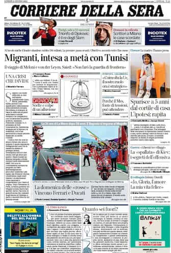 Corriere della Sera: apertura con titolo "Migranti, intesa a metà con Tunisi". Il viaggio di Meloni e von der Leyen. Saied: "Non farò la guardia di frontiera". Spazio a "Sparisce a 5 anni dal cortile di casa. L'ipotesi: rapita"