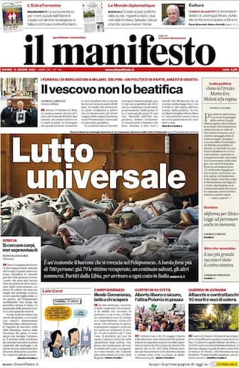Il Manifesto: apertura con titolo "Lutto universale". E' un'ecatombe il barcone che si rovescia nel Peloponneso. A bordo forse più di 700 persone: già 79 le vittime recuperate, un centinaio i salvati, gli altri sommersi. Partiti dalla Libia per arrivare a ogni costo in Italia
