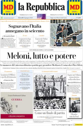 La Repubblica: apertura con titolo "Meloni, lutto e potere". La Premier si avvicina a Marina Berlusconi e vuole conquistare l'eredità politica del leader di Forza Italia: "Grazie Silvio, ti renderemo orgoglioso". Tajani cerca di frenare l'esodo dei parlamentari. I figli divisi durante la cerimonia in Duomo, trasmessa in diretta da venti canali televisivi