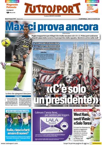 Tuttosport: apertura con titolo "C'è solo un presidente". Il coro dei tifosi per l'ultimo, incredibile, saluto a Berlusconi. Spazio a "Max ci prova ancora". Pogba trequartista per Allegri che studia una Juve col 4-3-1-2. Prima però andranno chiariti i piani della società e le prospettive della squadra. Novità in arrivo nello staff