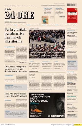 Il Sole 24 Ore: apertura con titolo "Per la giustizia penale arriva il primo ok alla riforma". Spazio a "Milano dà l'ultimo saluto a Berlusconi". Meloni: "Ti renderemo orgoglioso"