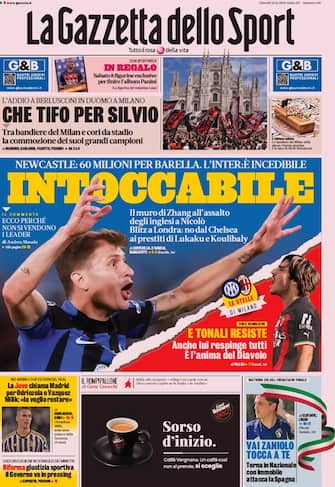 La Gazzetta dello Sport: apertura con titolo "Intoccabile". Newcastle: 60 milioni per Barella. L'Inter: è incedibile. Spazio a "Che tifo per Silvio". L'addio a Berlusconi in Duomo a Milano