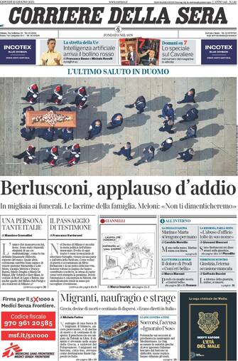 Corriere della Sera: apertura con titolo "Berlusconi, applauso d'addio". In migliaia ai funerali. Le lacrime della famiglia. Meloni: "Non ti dimenticheremo"