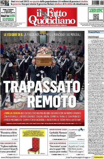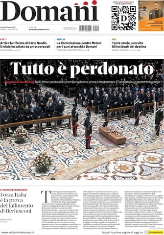 Domani: apertura con titolo "Tutto è perdonato". I funerali di Berlusconi: nell'ultimo saluto all'ex premier la destra prova a trasformare il Caimano in un padre della patria