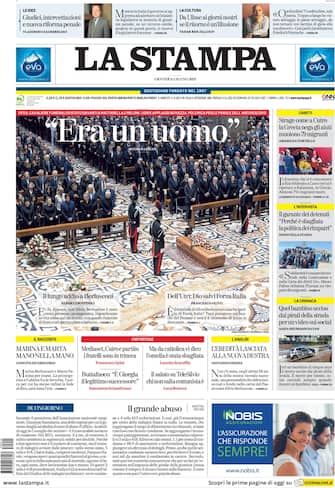 La Stampa: apertura con titolo "Era un uomo". Per il Cavaliere funerali di Stato davanti a Mattarella e Meloni. Cori e applausi in piazza. Polemiche per le parole dell'Arcivescovo