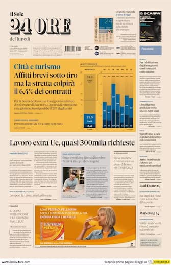 Il Sole 24 Ore: apertura con titolo "Affitti brevi sotto tiro ma la stretta colpità il 6,4% dei contratti". Spazio a "Lavoro extra Ue, quasi 300mila richieste"