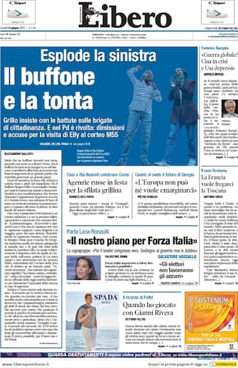 Libero: apertura con titolo "Il buffone e la tonta". Grillo insiste con le battute sulle brigate di cittadinanza. E nel Pd è rivolta: dimissioni e accuse per la visita di Elly al corteo M5S