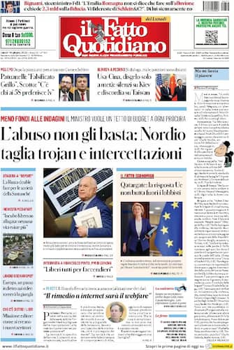 Il Fatto Quotidiano: apertura con titolo "L'abuso non gli basta: Nordio taglia trojan e intercettazioni". Il Ministro vuole un tetto di budget a ogni procura