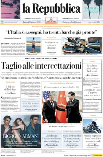 La Repubblica: apertura con titolo "Taglio alle intercettazioni". Dopo il giro di vite sulla pubblicazione delle telefonate, il ministro Nordio ora vuole limitare il budget per gli ascolti